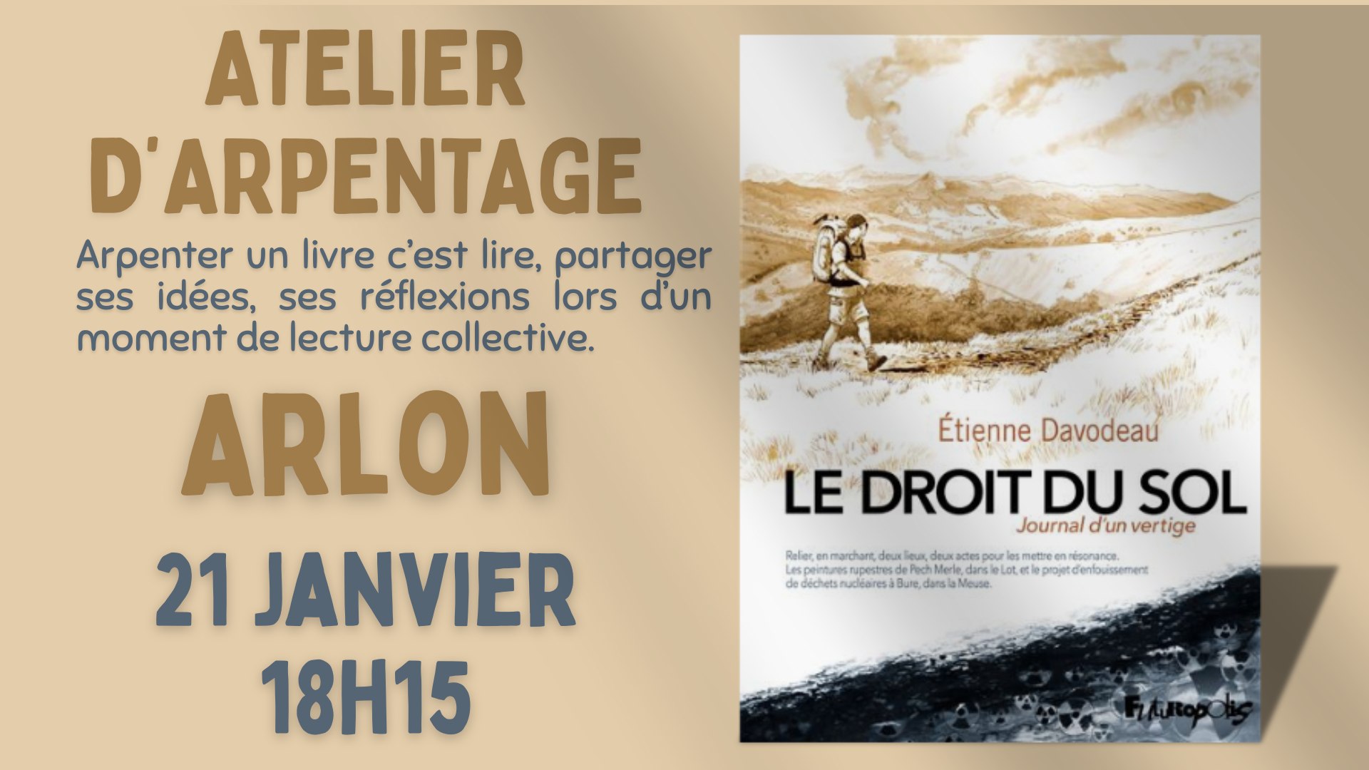 𝗠𝗲𝗿𝗰𝗿𝗲𝗱𝗶 𝟮𝟭.𝟬𝟭| 📍 𝐀𝐑𝐋𝐎𝐍| 𝗔𝘁𝗲𝗹𝗶𝗲𝗿 𝗱'𝗮𝗿𝗽𝗲𝗻𝘁𝗮𝗴𝗲 📖 𝘘𝘶'𝘦𝘴𝘵-𝘤𝘦 𝘲𝘶𝘦 𝘤'𝘦𝘴𝘵 ? Arpenter un livre, c'est lire, partager ses idées, réflexions lors d'un moment de lecture collective. Pour débuter l'année « 𝗟𝗲 𝗱𝗿𝗼𝗶𝘁 𝗱𝘂 𝘀𝗼𝗹 » d'Etienne Davodeau (2021).