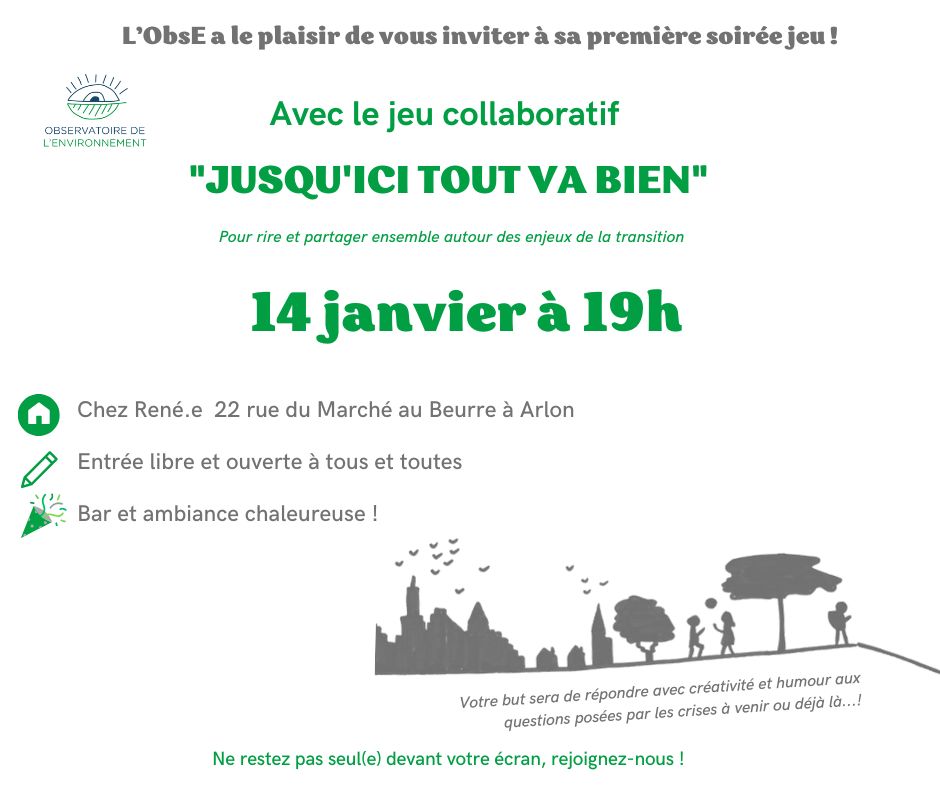 L'ObsE - Observatoire de l'Environnement a le plaisir de vous inviter à sa première soirée jeu, avec le jeu collaboratif "JUSQU'ICI TOUT VA BIEN". C'est pour rire et partager ensemble autour des enjeux de la transition.